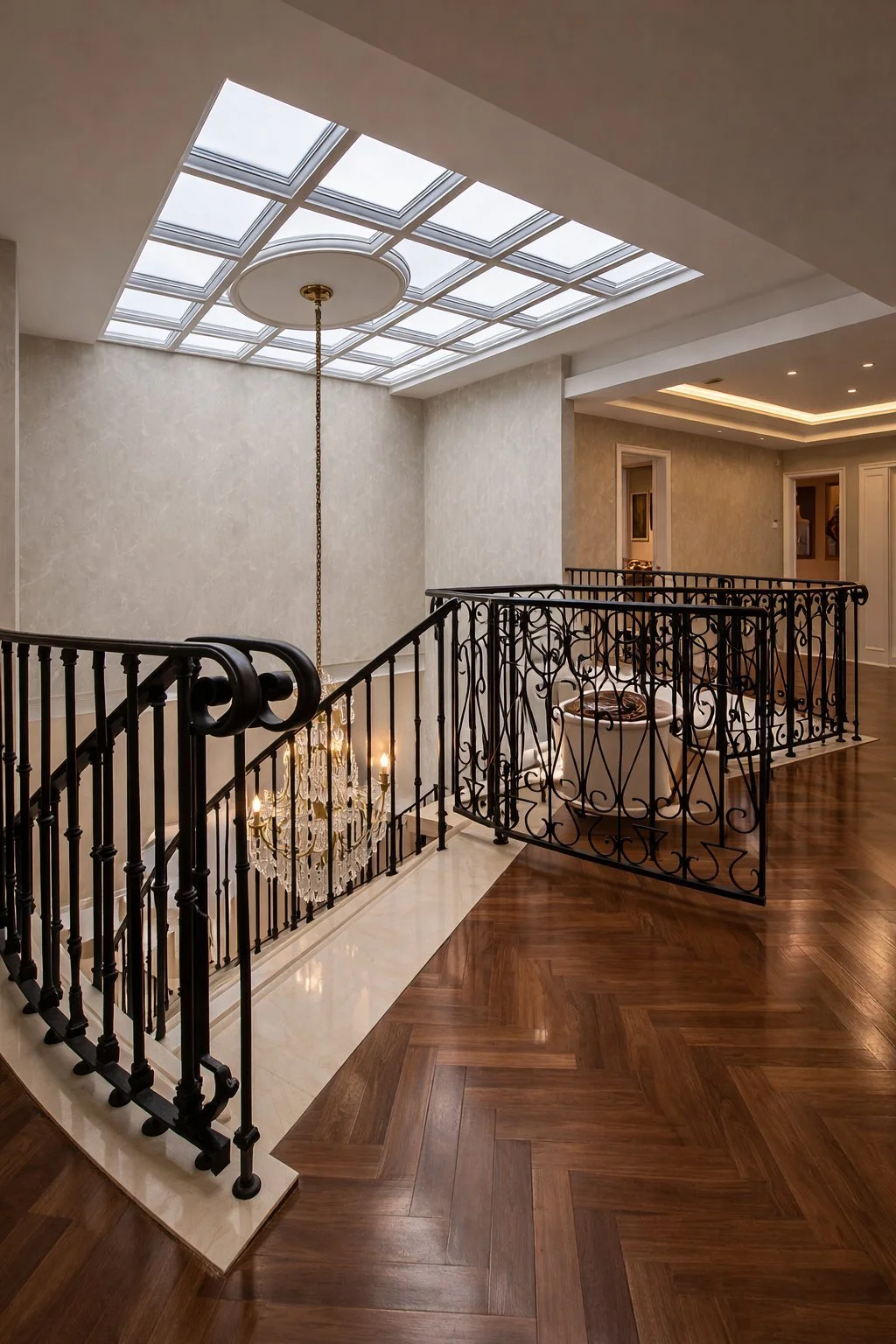 O acesso se dá por um port cochère elegante, proporcionando chegada protegida e imponente. O hall de entrada apresenta pé-direito de 10 metros de altura, coroado por um lustre de cristal adquirido de um antigo teatro argentino, criando uma atmosfera de grandiosidade que se prolonga pela escadaria revestida em mármore italiano Crema Marfil, peça central da composição arquitetônica. Um elevador interno garante acessibilidade total e conforto em todos os pavimentos.